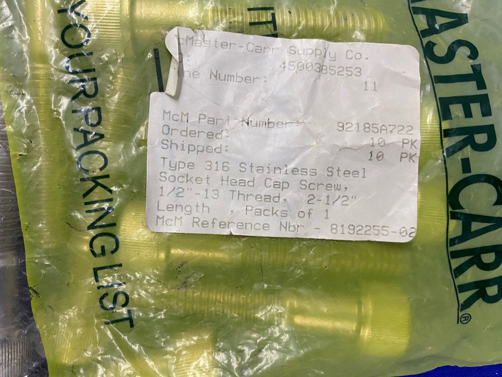 MCMASTER-CARR 92185A722 TORNILLO DE CABEZA HUECA DE ACERO INOXIDABLE 316 ROSCA DE 1/2"-13 1 PAQUETE CANTIDAD 10