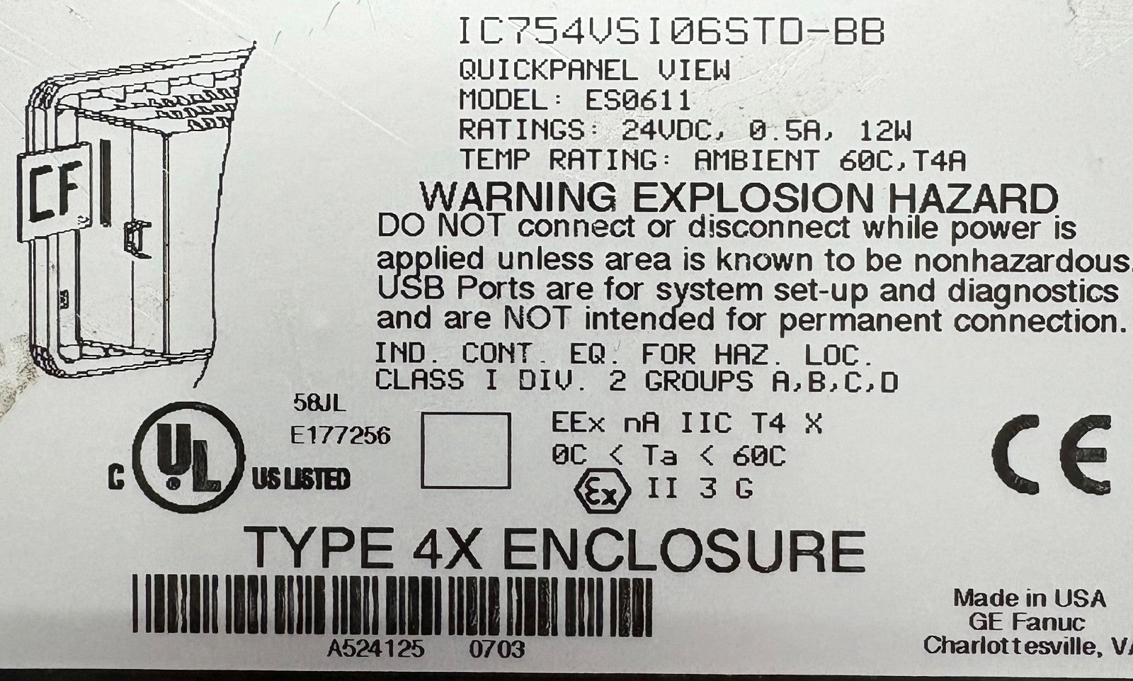 GE FANUC QUICKPANEL VIEW IC754VSI06STD-BB ES0611 24VDC OPERATOR INTERFACE PANEL