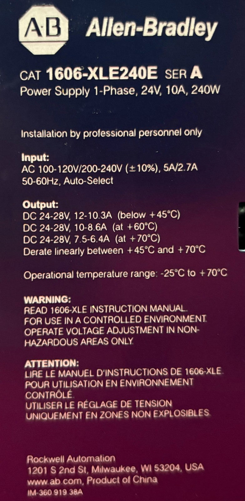 Allen Bradley AB POWER SUPPLY 16006-XLE / 1606-XLE240E SER. A
