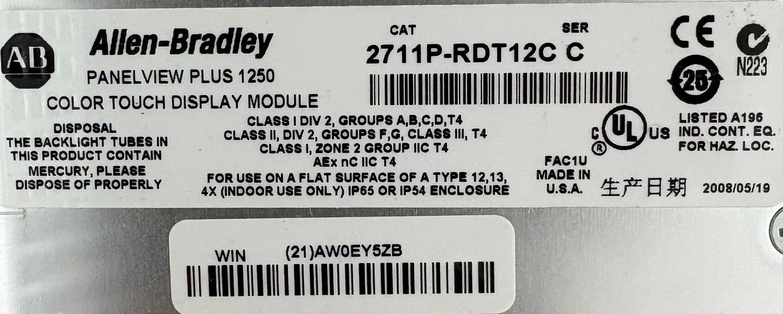 Allen Bradley AB PANELVIEW PLUS 1250 2711P-RP1 SER G LOGIC MODULE - PARTS/REPAIR
