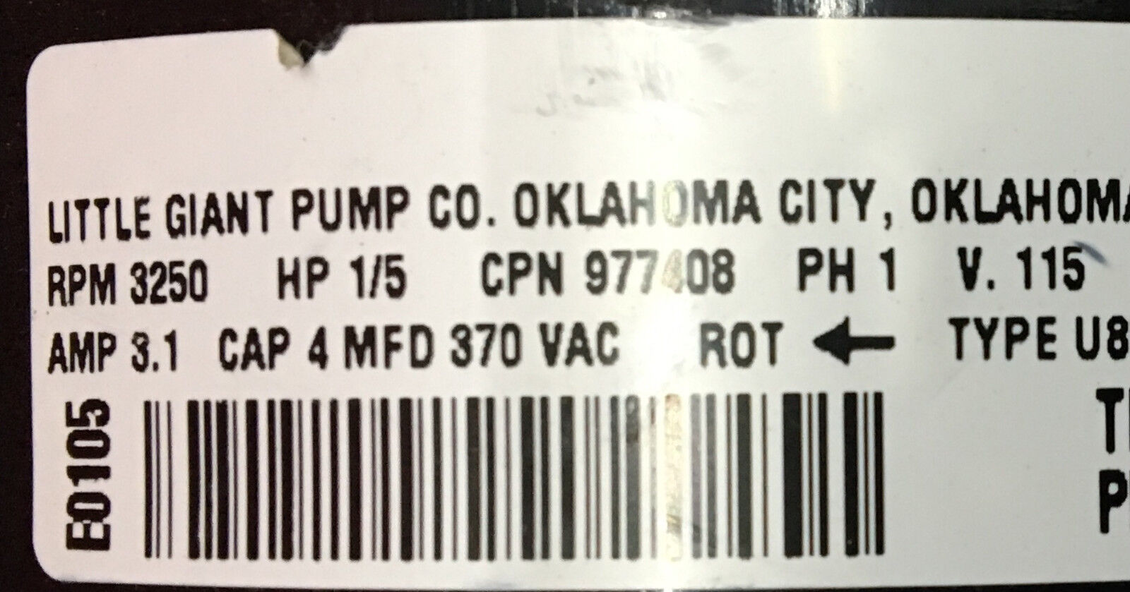 LITTLE GIANT POMP TYPE U8581 RPM 3250 PK 1/5 V115