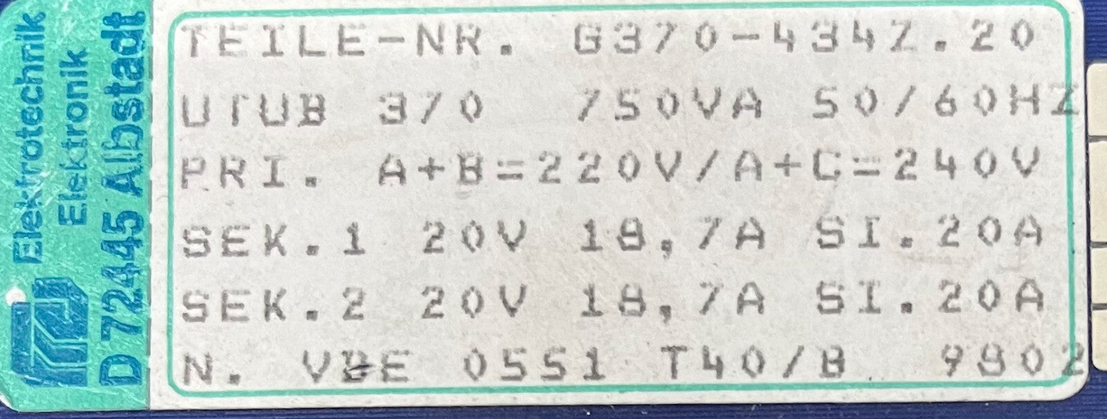 ELEKTROTECHNIK TEILE-Nr G370-434Z.20 POWER SUPPLY TRANSFORMER 750VA